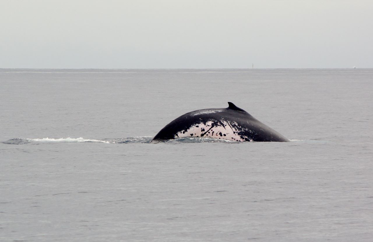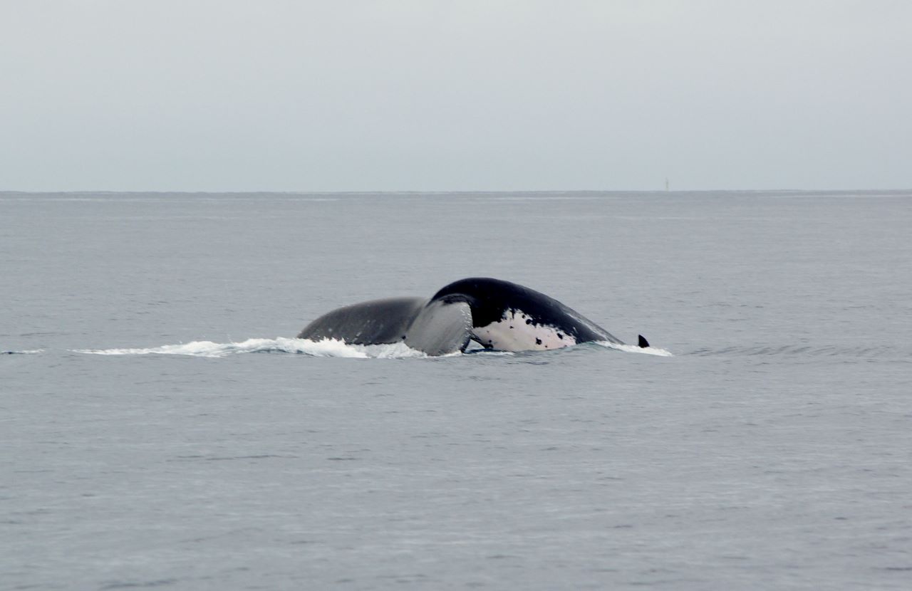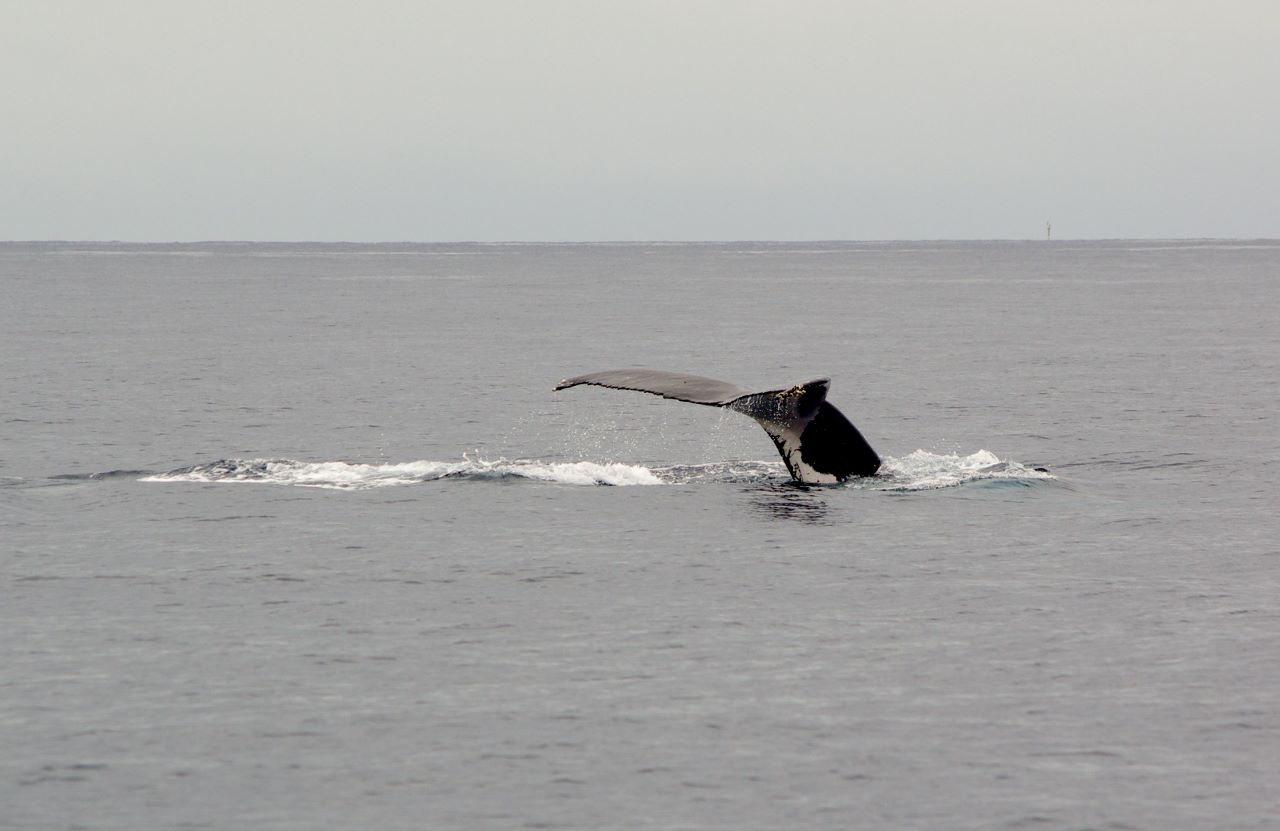 La passe Havannah est franchie vers dix heures, tranquillement, et nous voici à nouveau dans l’immense lagon sud. Nous cherchons un mouillage pour la journée, mollement car le temps est couvert. Quand soudain la vigie s’époumone : « Elle souffle ! ». À deux milles au sud, quelques voiliers au moteur tournent en rond, et aux jumelles, une queue se lève.
