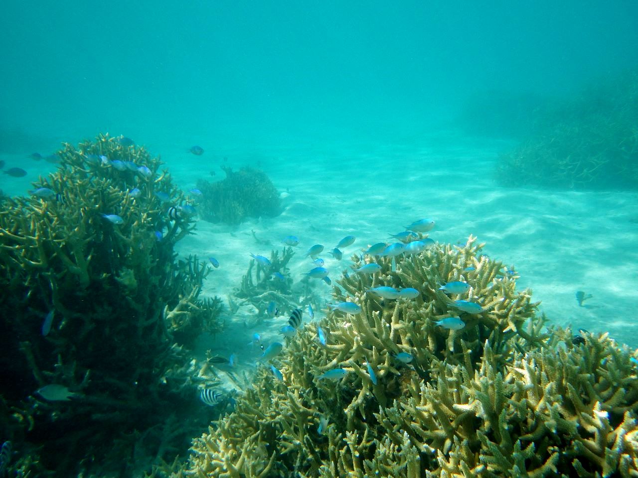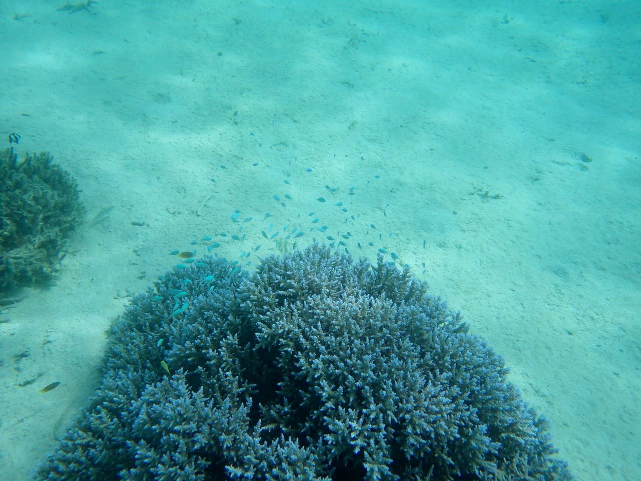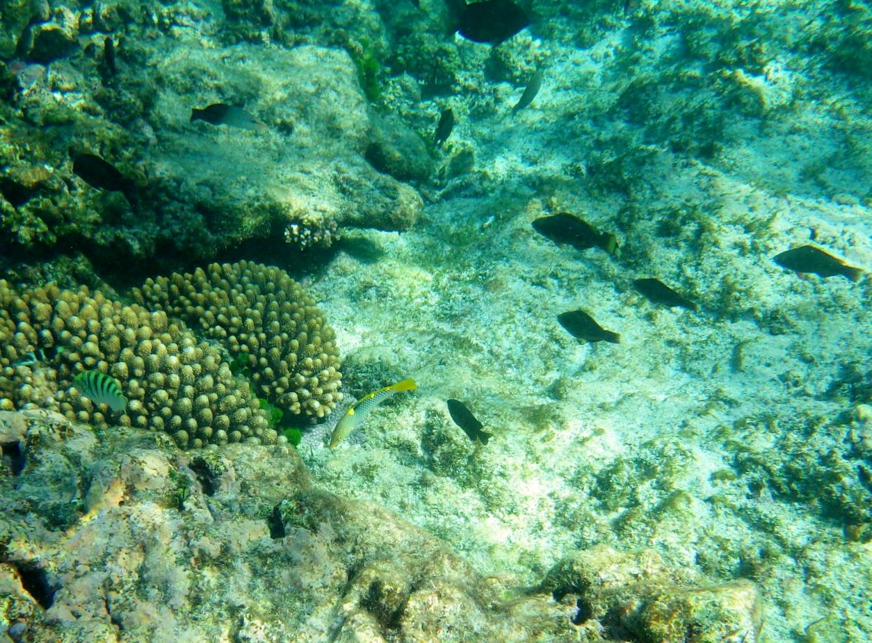 L’eau est claire, mais le ressac la rend un peu opaline. Les coraux à l’intérieur du lagon sont assez abîmés, mais il y a beaucoup de poissons, des seiches, des raies…