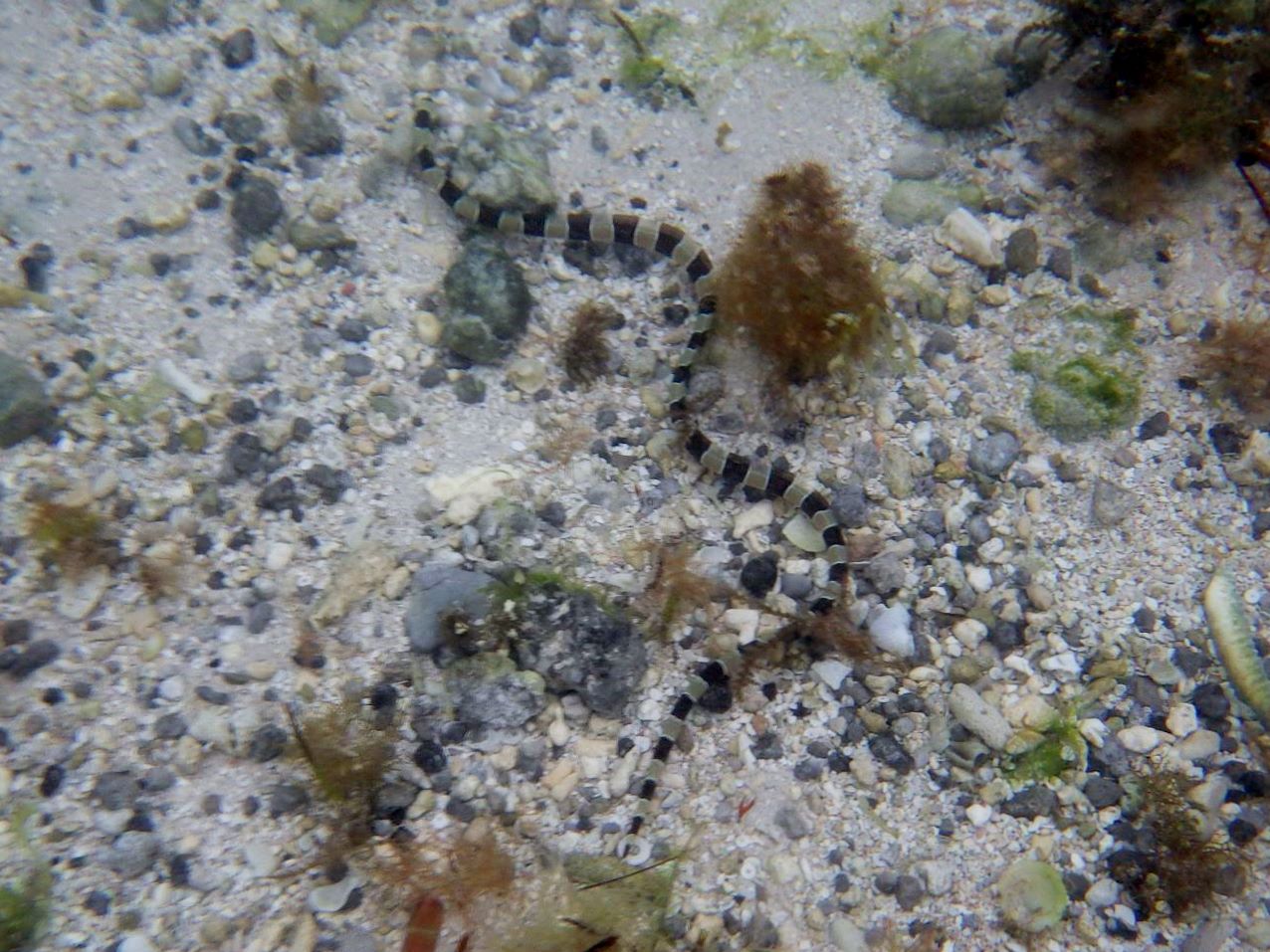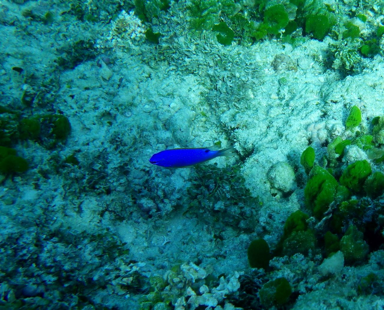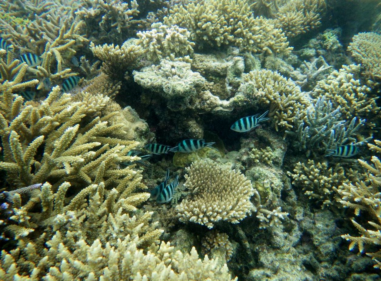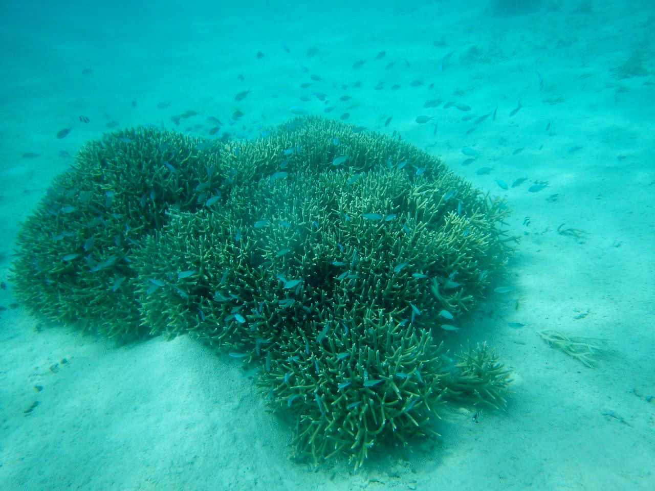 L’eau est claire, mais le ressac la rend un peu opaline. Les coraux à l’intérieur du lagon sont assez abîmés, mais il y a beaucoup de poissons, des seiches, des raies…