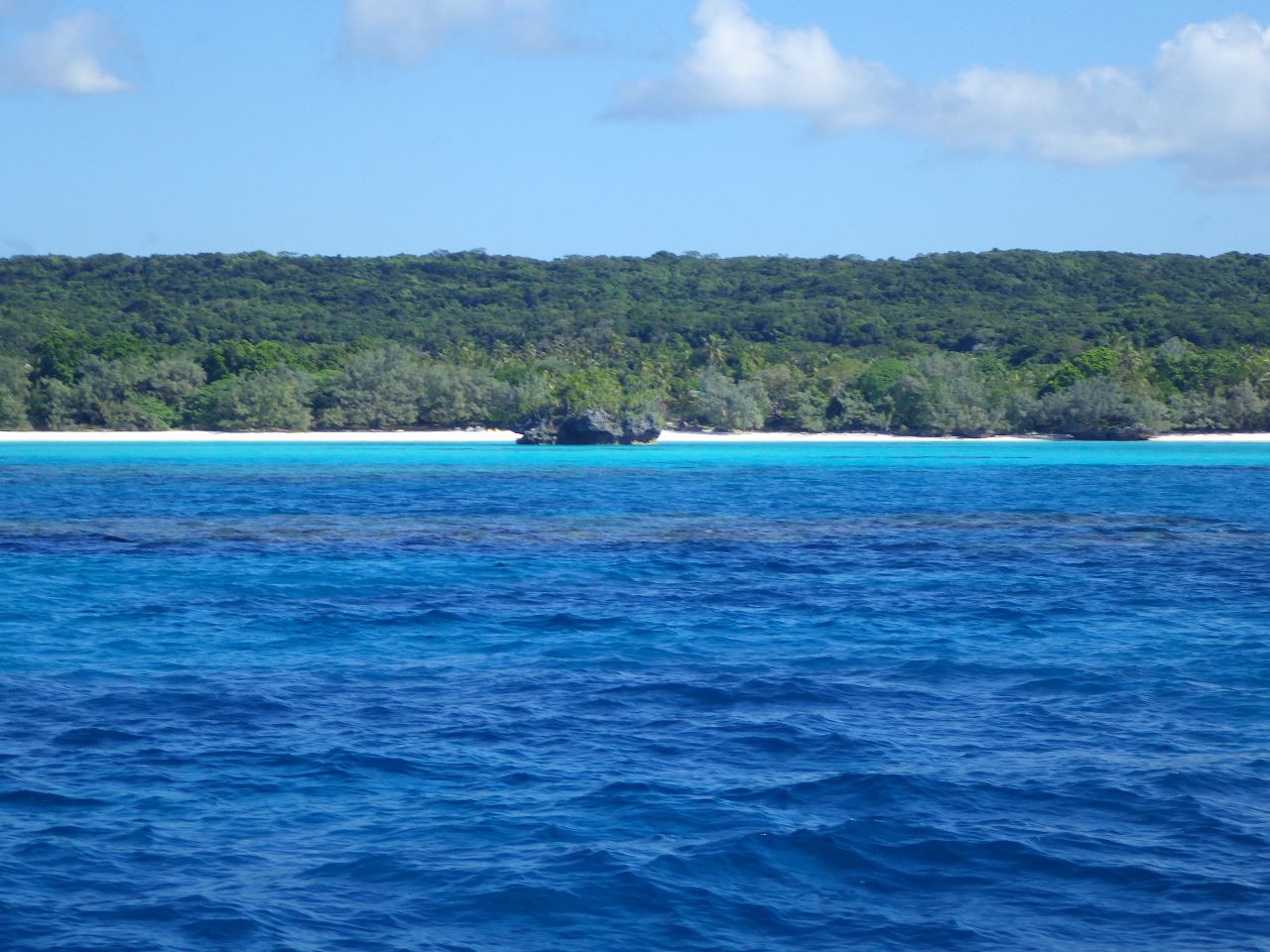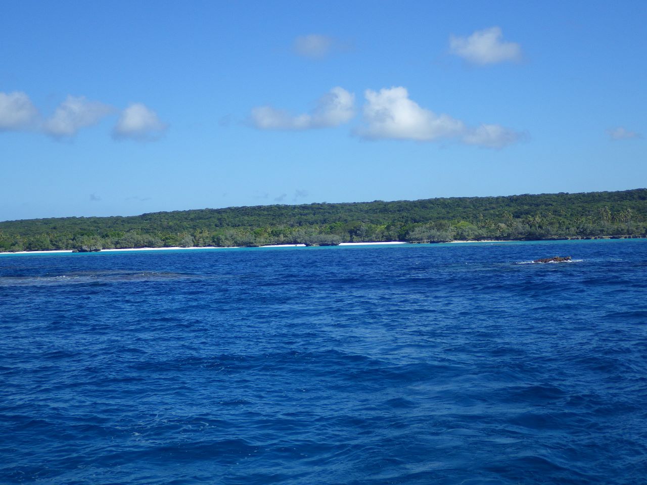 23 juillet. Départ de Tadine à quatre heures du matin comme prévu pour avaler la cinquantaine de milles avant Lifou et arriver de jour. L’objectif est de mouiller devant Doueoulou sur la côte ouest, mais le vent plutôt faiblard fera que nous nous dirigerons vers Luengoni, à l’est et donc vent de travers au lieu d’un grand largue mollasson. Nous avons repéré un mouillage qui a l’air fort sympathique sur un guide que nous a passé Sylvain, de Thétis.