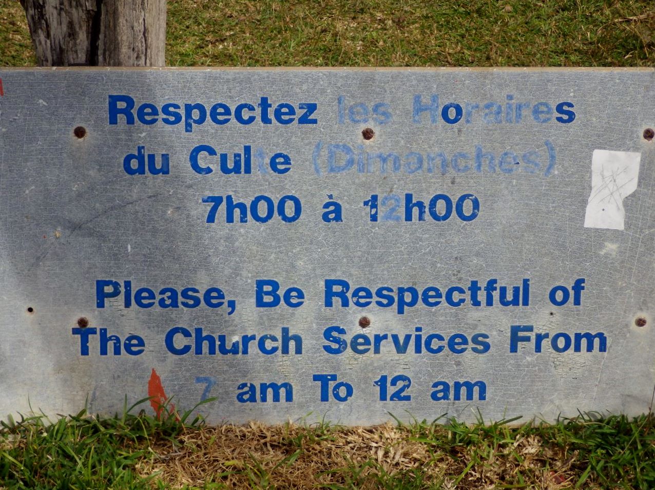 Nous apprenons que les cavités dans la falaise servaient de sépulture aux morts, avant l’arrivée des missionnaires, qui eux savaient mieux que les autres, forts de leur dieu évidemment plus puissant. D’ailleurs, l’affichage près de la petite église laisse perplexe…