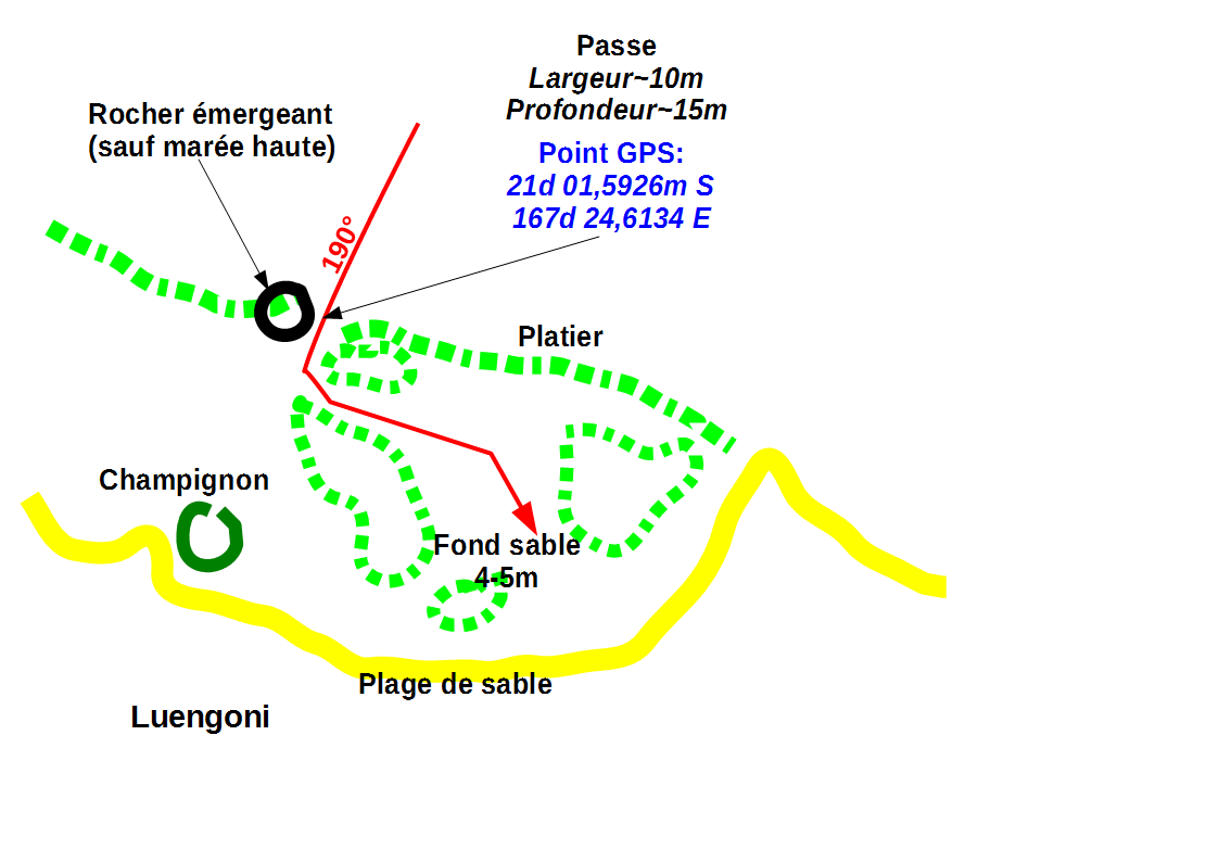 Une difficulté est d’identifier l’entrée de la passe, marquée sur sa droite par un caillou émergeant dès la mi-marée, avec un champignon visible près de la plage (le plus à l’est des deux ou trois champignons visibles). Ce champignon donne une bonne approximation d’alignement (au 190°) pour franchir la passe. Ne surtout pas faire l’économie d’une vigie à l’avant, équipée de lunettes polarisantes ! La passe est très étroite (une dizaine de mètres), mais franche et courte, avec une quinzaine de mètres d’eau en dessous, et le platier de part et d’autre bien visible.