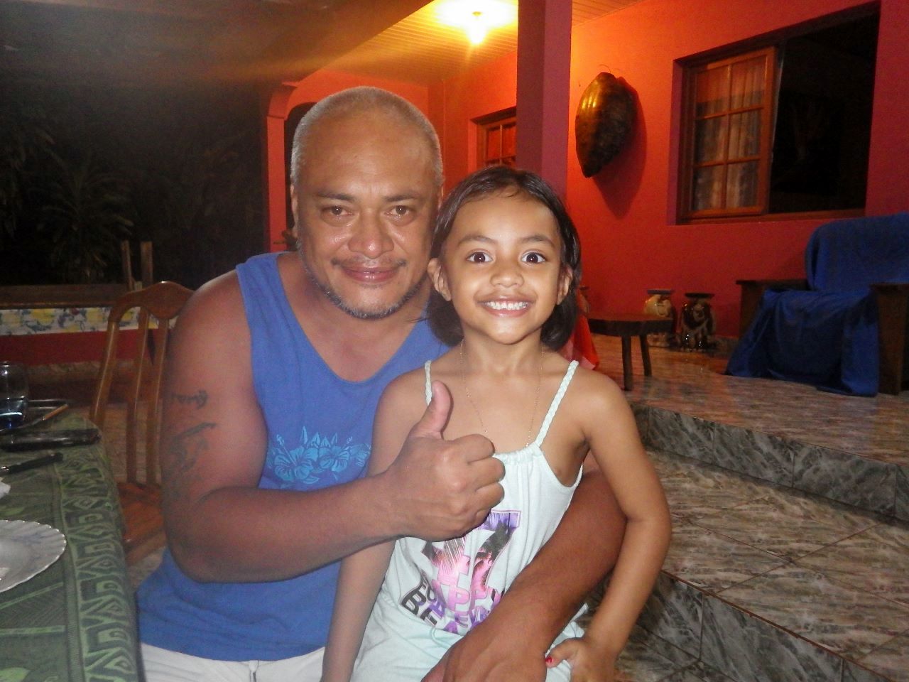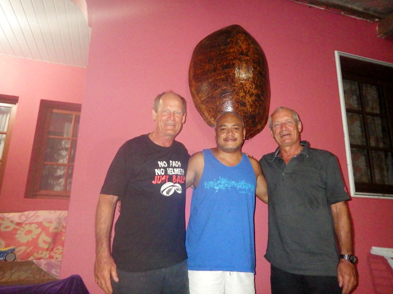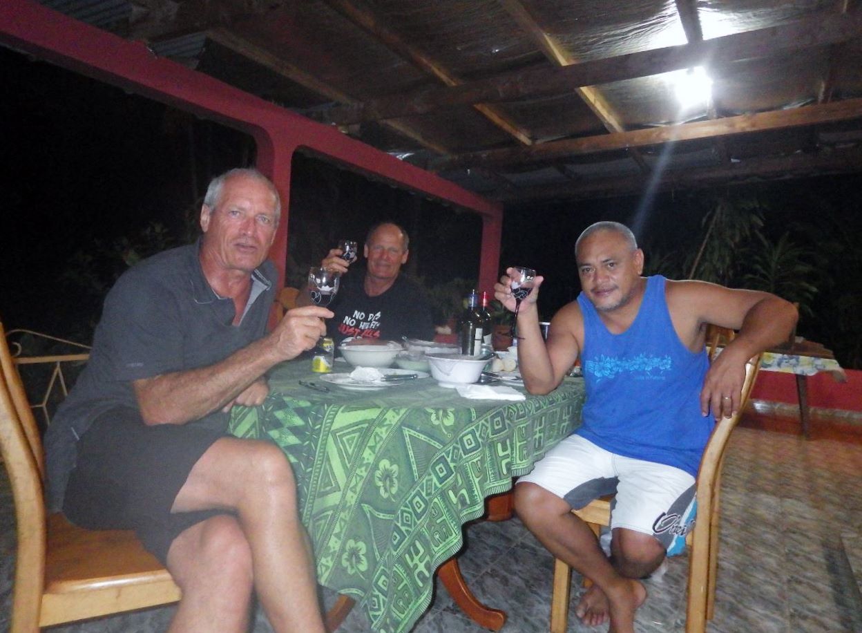 Nous rencontrons enfin Tomy, le Wallisien copain de Bernard et qui a joué au rugby avec lui à Antibes. La soirée va passer à se rappeler les souvenirs communs, à essayer d’en savoir un peu plus sur Wallis, et à déguster les plats locaux qui avaient été préparés : salade de perroquet cru au lait de coco, poulpe, taro, arbre à pain.