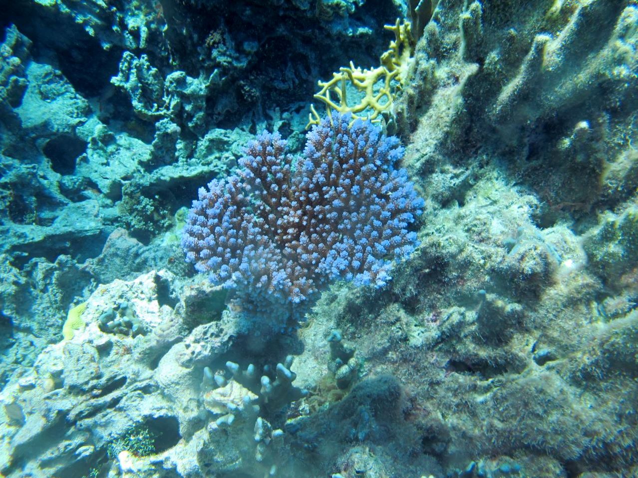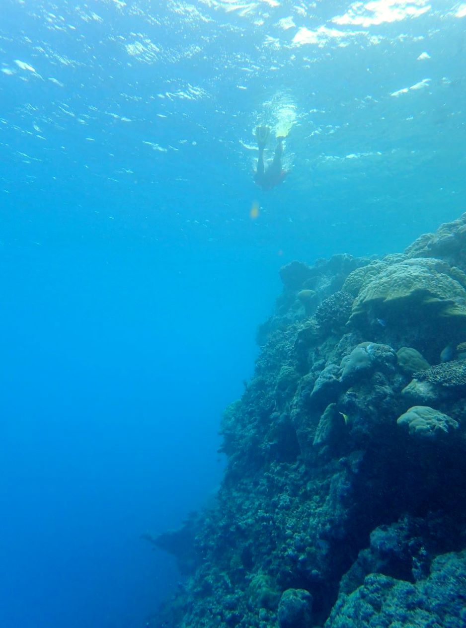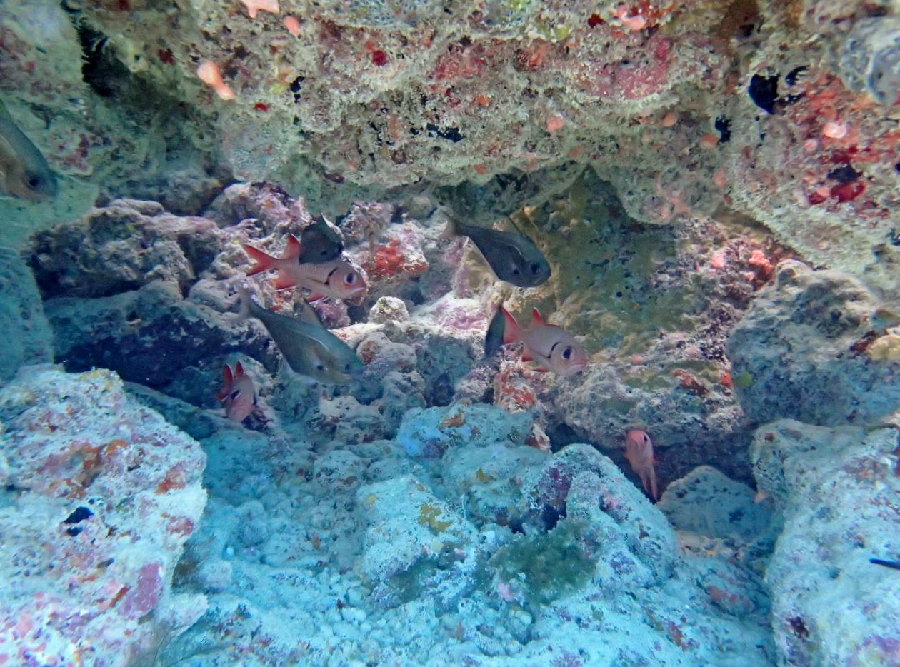 27 mai. Nous nous déplaçons vers la barrière du lagon pour une plongée dans le Trou de la Tortue, une cavité d’une vingtaine de mètres de profondeur, à la limite de l’atoll. Les poissons sont jolis, mais le corail semble avoir un peu souffert.
