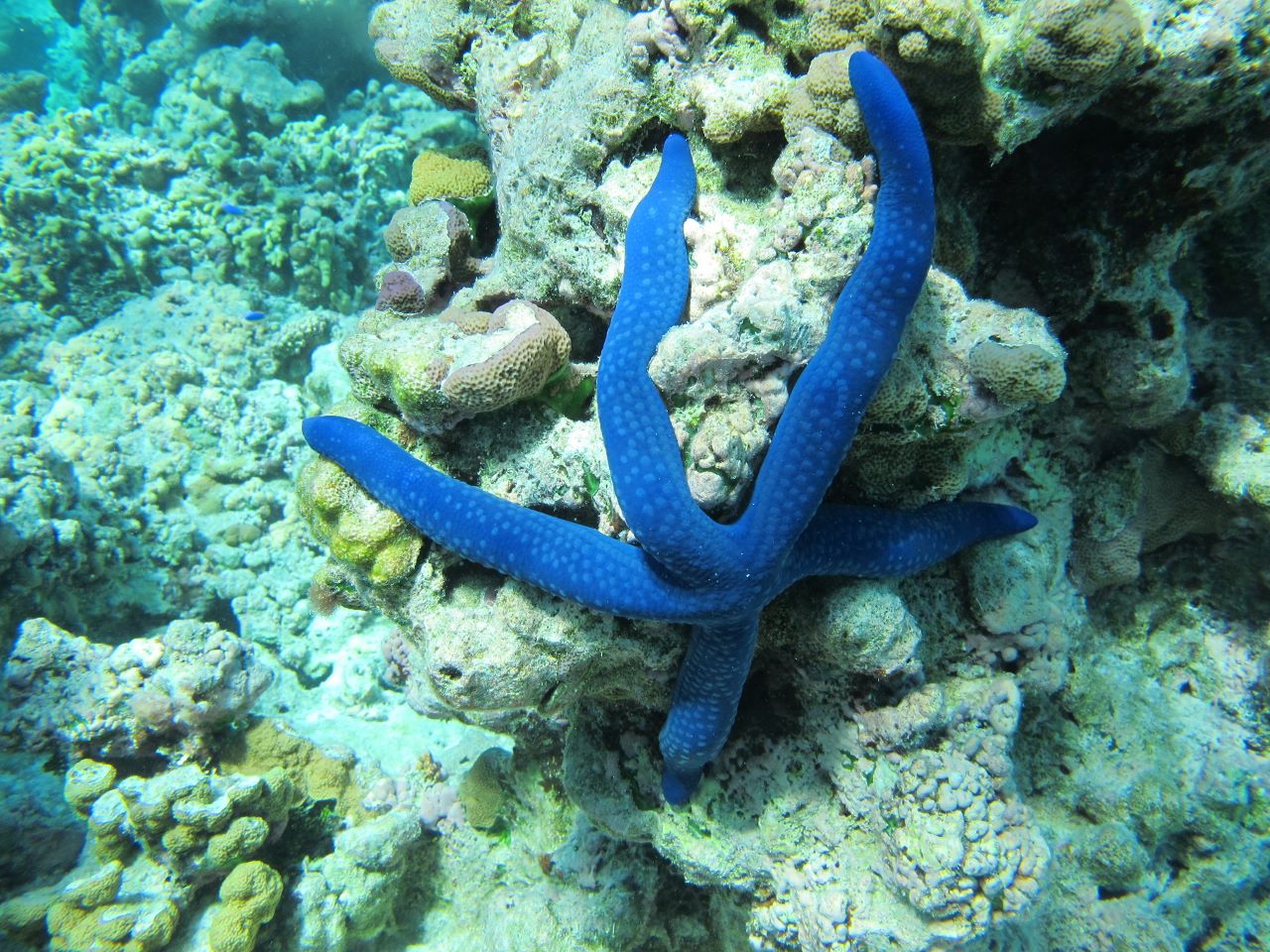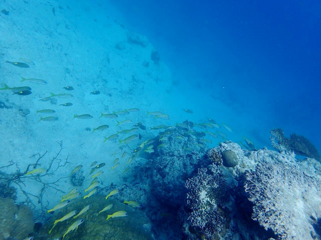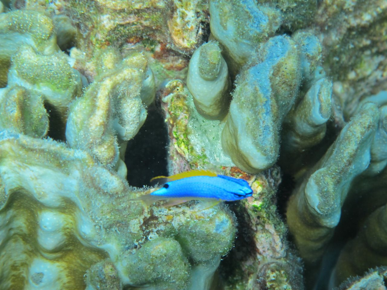 27 mai. Nous nous déplaçons vers la barrière du lagon pour une plongée dans le Trou de la Tortue, une cavité d’une vingtaine de mètres de profondeur, à la limite de l’atoll. Les poissons sont jolis, mais le corail semble avoir un peu souffert.