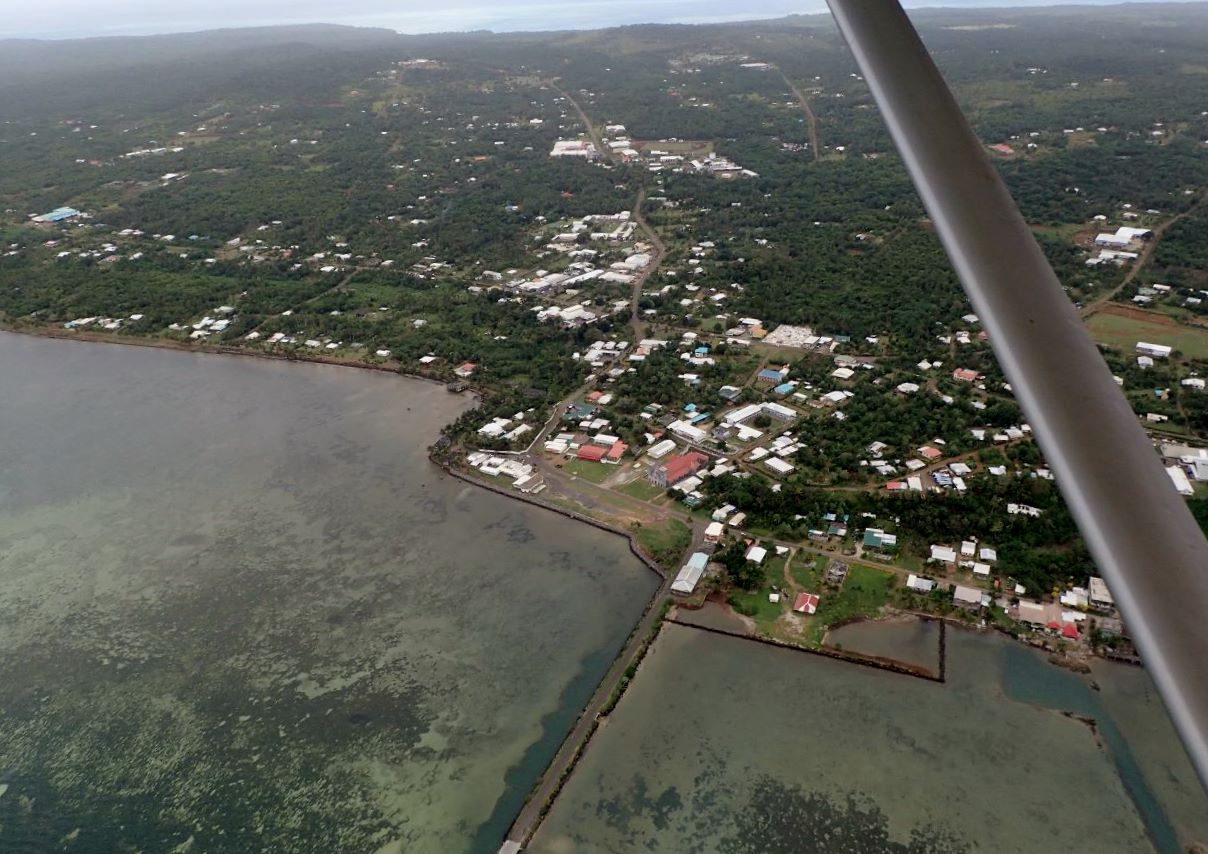 Six heures : Alofi et Futuna ne sont plus qu’à quelques milles, et nous nous engageons dans le chenal Vasia qui sépare les deux îles. Un petit platier déborde d’Alofi. Nous apercevons le petit aéroport, coincé entre la mer et la montagne.