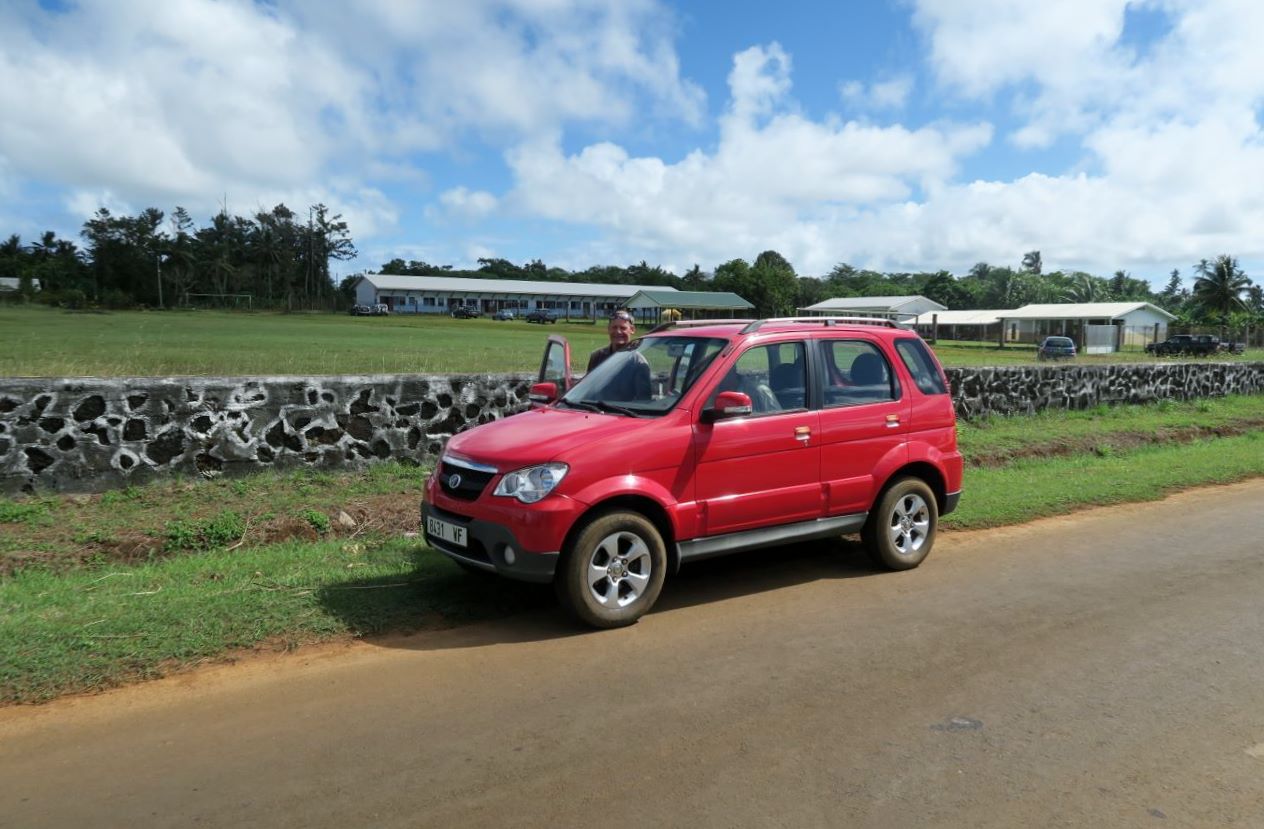 Nous louons une voiture pour faire un tour d’ Uvea. Notre voiture sera une Zotie chinoise affichant vingt mille kilomètres au compteur : plus une portière ne s’ouvre correctement, et le loueur nous recommande de ne pas essayer d’abaisser les vitres ! Heureusement, la climatisation marche encore. Ces voitures ne sont pas chères, mais il semble que l’on en ait pour son argent. Et les pièces de rechange sont apparemment difficiles à obtenir… Irène nous avait déjà raconté la même histoire avec sa voiture, chinoise elle aussi. Nous ménagerons notre carrosse !