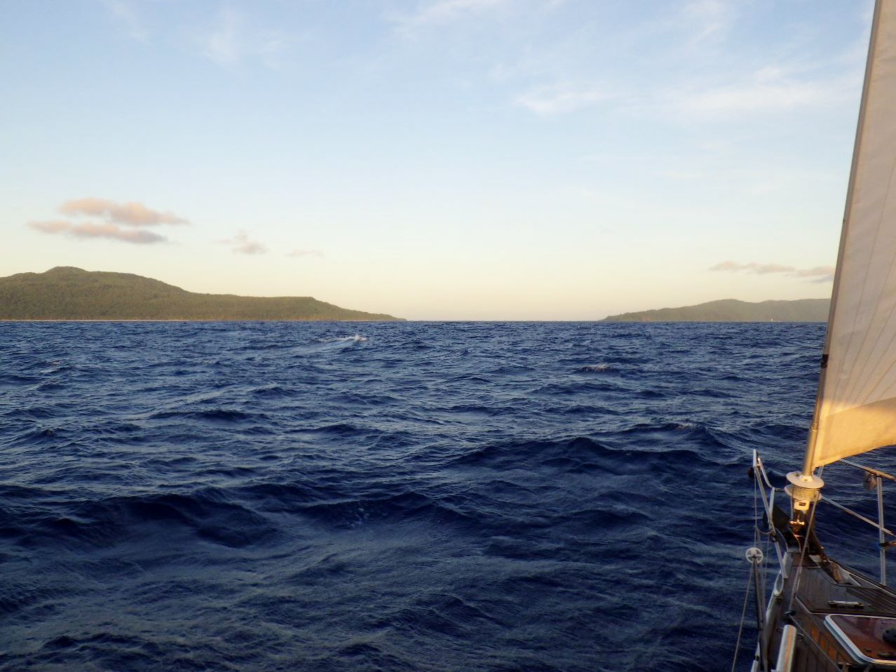 Il y a à peu près cent vingt milles jusqu’à Futuna, et le vent d’est autour de vingt nœuds est favorable : il faudra surveiller notre progression pour ne pas arriver de nuit ! Vers dix heures, l’ancre est levée et la grand-voile hissée avec un ris, puis un demi-génois : nous somme déjà à plus de huit nœuds dans le lagon. Un peu plus d’une heure après, la passe de Honikulu est franchie, toujours à la voile, à presque sept nœuds : le courant de face est relativement faible et il n’y a pratiquement pas de houle.