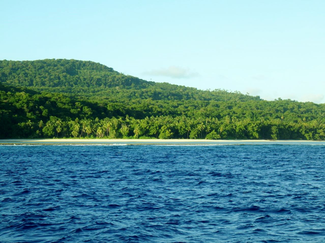 Huit heures trente : nous sommes mouillés par dix mètres de fond devant le village de Leava, à côté du quai de débarquement pour le cargo qui avitaille l’île.
