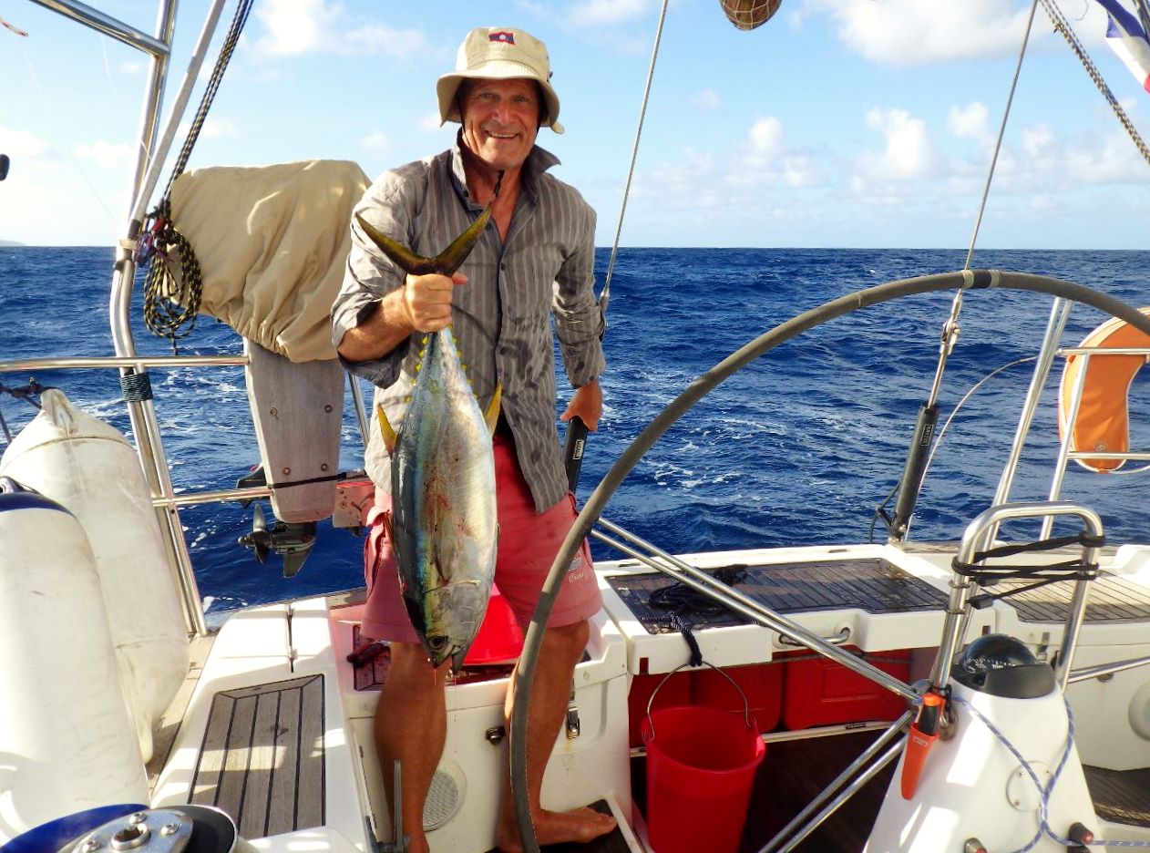 Soudain, « Dddzzzzzzzziiiiiiii ! » fait le moulinet… Faut que j’y aille : André a attrapé quelque chose et il faut ralentir le bateau. Ma foi : c’est un beau thon jaune de sept kilos pris à huit heures PM1. Les leçons de Momo porteraient-elles leurs fruits ? A deux, on va avoir à manger pour quelques jours !