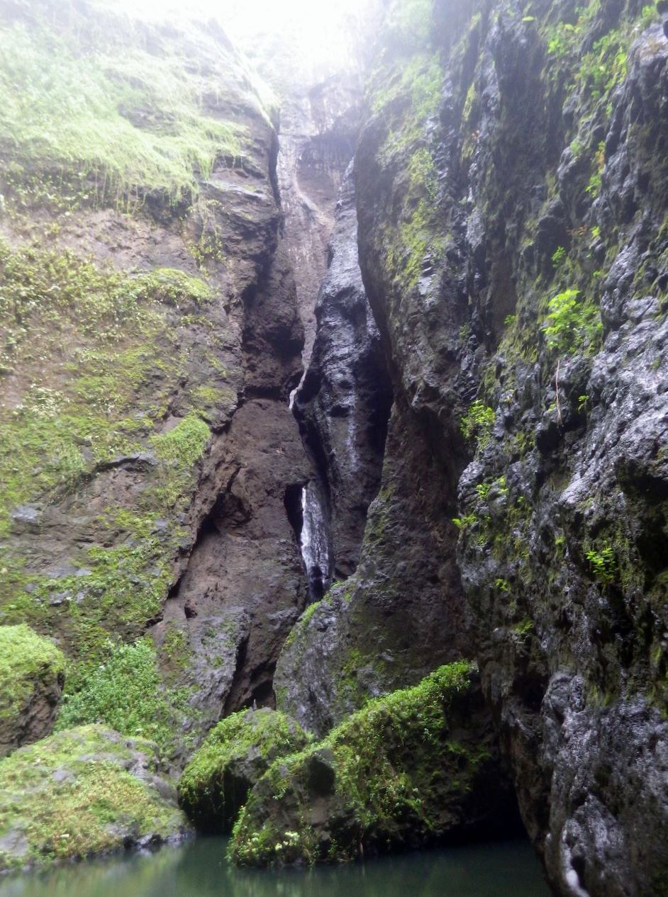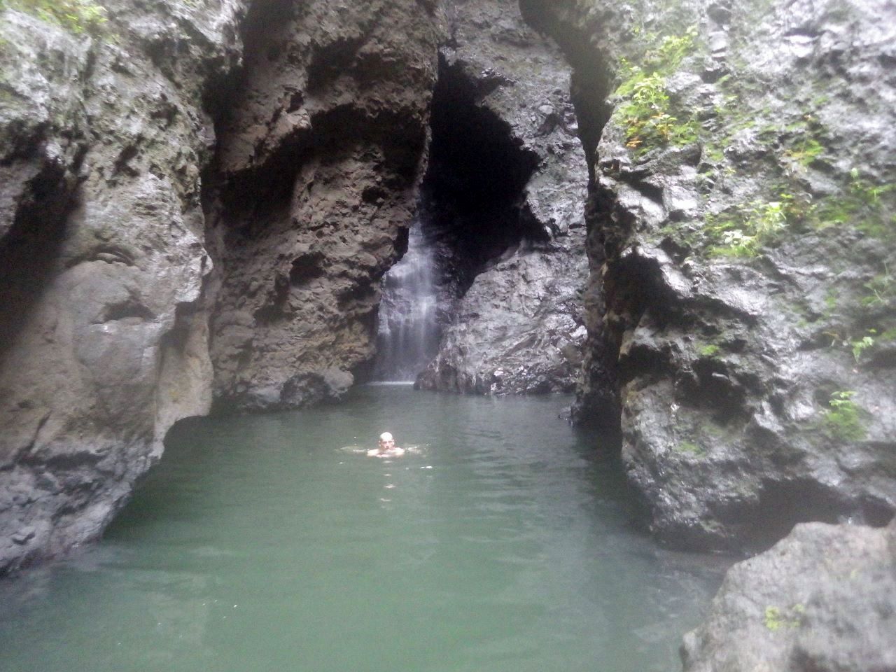 La cascade est atteinte après un peu moins de deux heures de marche. Le site est grandiose: un cirque très étroit entre des falaises de lave de près de 400m de haut. Mais comme la saison des pluies est derrière nous, la chute se limite à un petit filet d’eau… Une vasque permet de se baigner et d’observer les fameuses chevrettes, qui nous montent le long des mollets dès qu’on s’arrête.