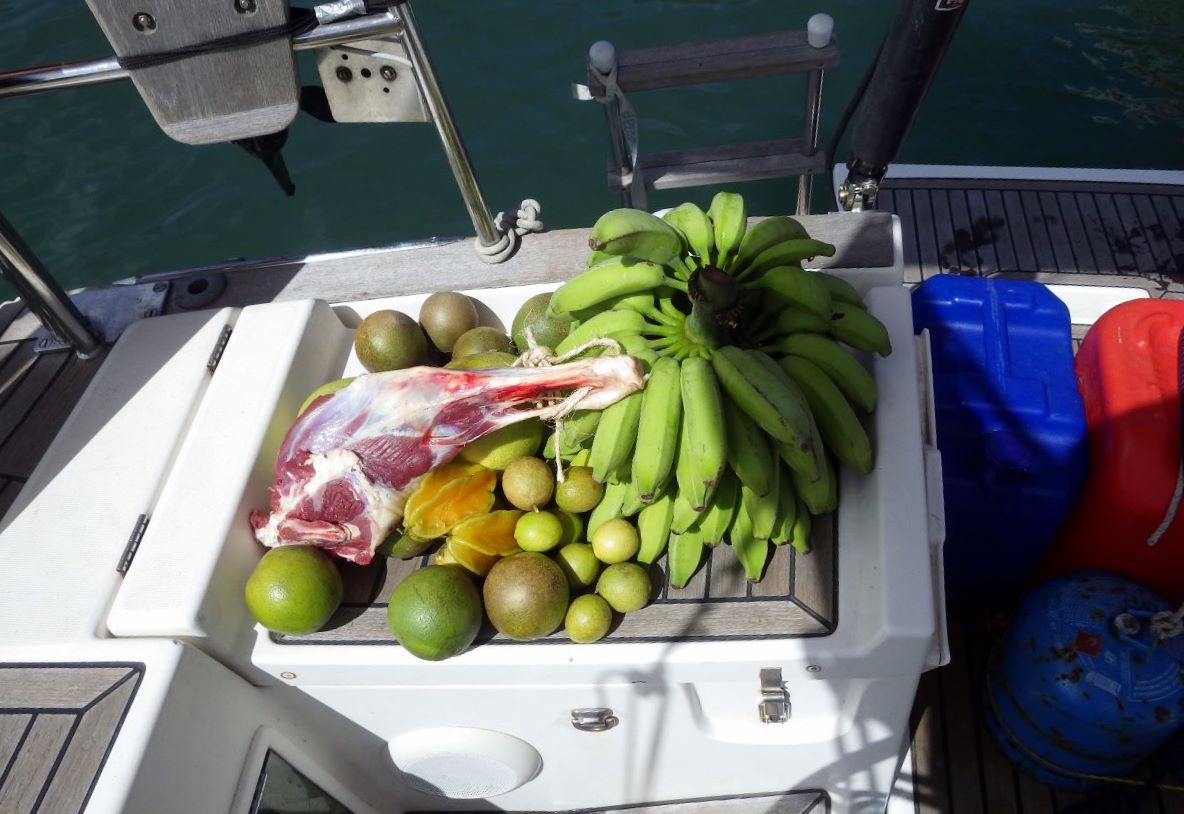 Nous revoyons donc Alexandre, qui rigole encore du quiproquo. Du coup, il nous charge de fruits (pamplemousses, bananes, caramboles, oranges, citrons) et d’un gigot d’agneau… Et nous invite à manger le soir, de la chèvre sauvage au lait de coco, avec le groupe de touristes que nous avons croisé!