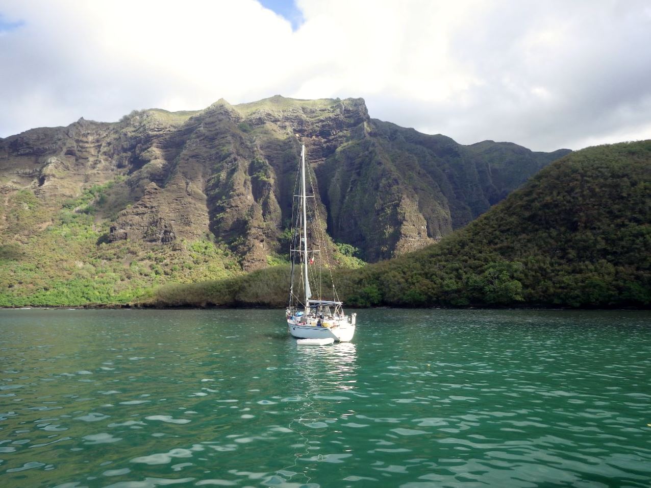 Dans l’après-midi, nous décidons d’aller mouiller dans la baie de Taioa, à un peu plus de 5 milles vers l’Ouest, d’où nous voulons aller voir la cascade de Haipô, dans la vallée de Hakau’i, une des plus haute du monde. Le mouillage est magnifique. Seuls trois autres bateaux seront nos voisins pendant ce court séjour.
