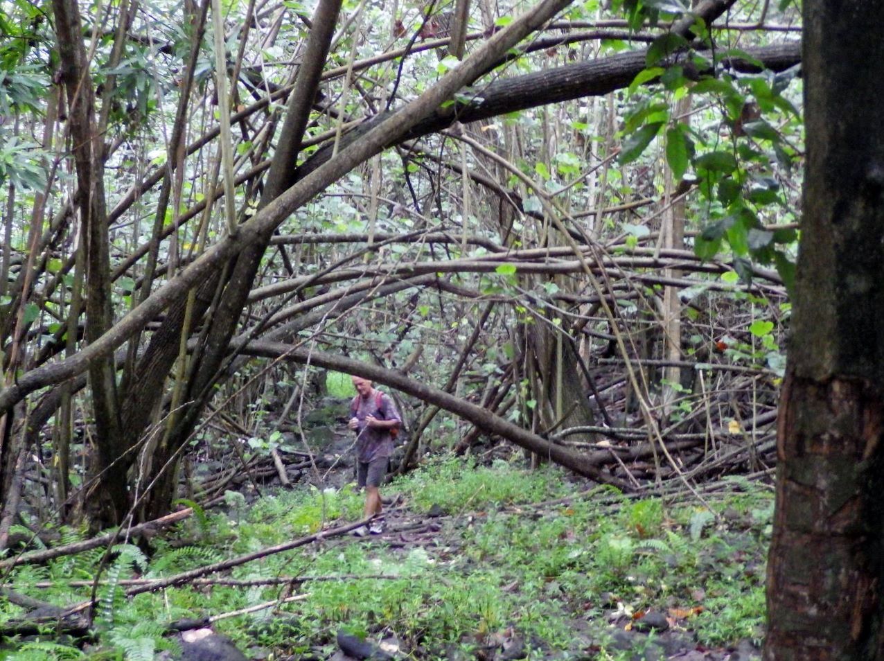 Sur le chemin du retour, nous croisons plusieurs touristes comme nous, dont un groupe accompagné d’un guide local: « C’est vous qui cherchez Jean-Pierre? C’est moi: je suis Teiki, le neveu de Cécilia. Alexandre est mon beau-père, mais il ne connaît pas mon prénom français… ».