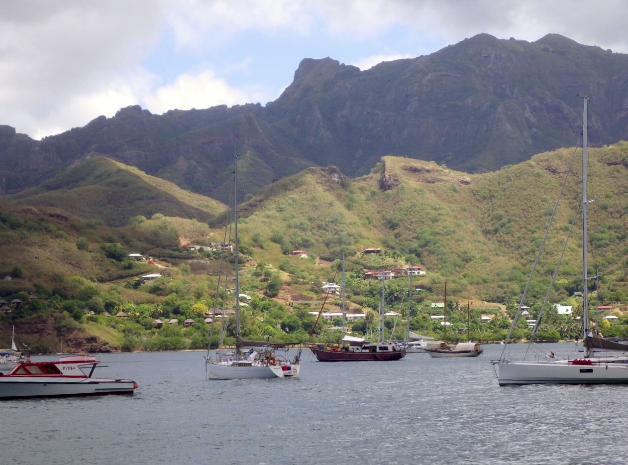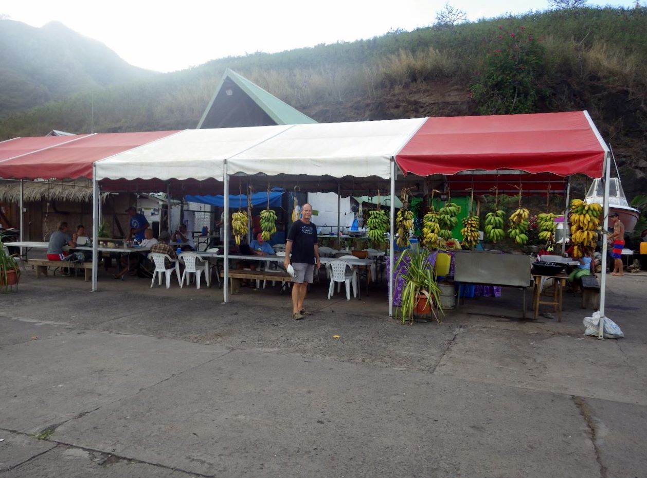 Ici, le mouillage est moins forain qu’à Hiva Oa. La baie est immense, et un bonne cinquantaine de voiliers de toutes nationalités sont à l’ancre, y compris un beau voilier britannique de 78m, avec hydravion sur le pont: sans doute des chômeurs en fin de droit… Deux restaurants sont installés sur le quai, et accueillent les voyageurs. Notre préférence va pour le bistrot d’Henri, pratique pour manger pas trop cher, et se connecter à internet.
