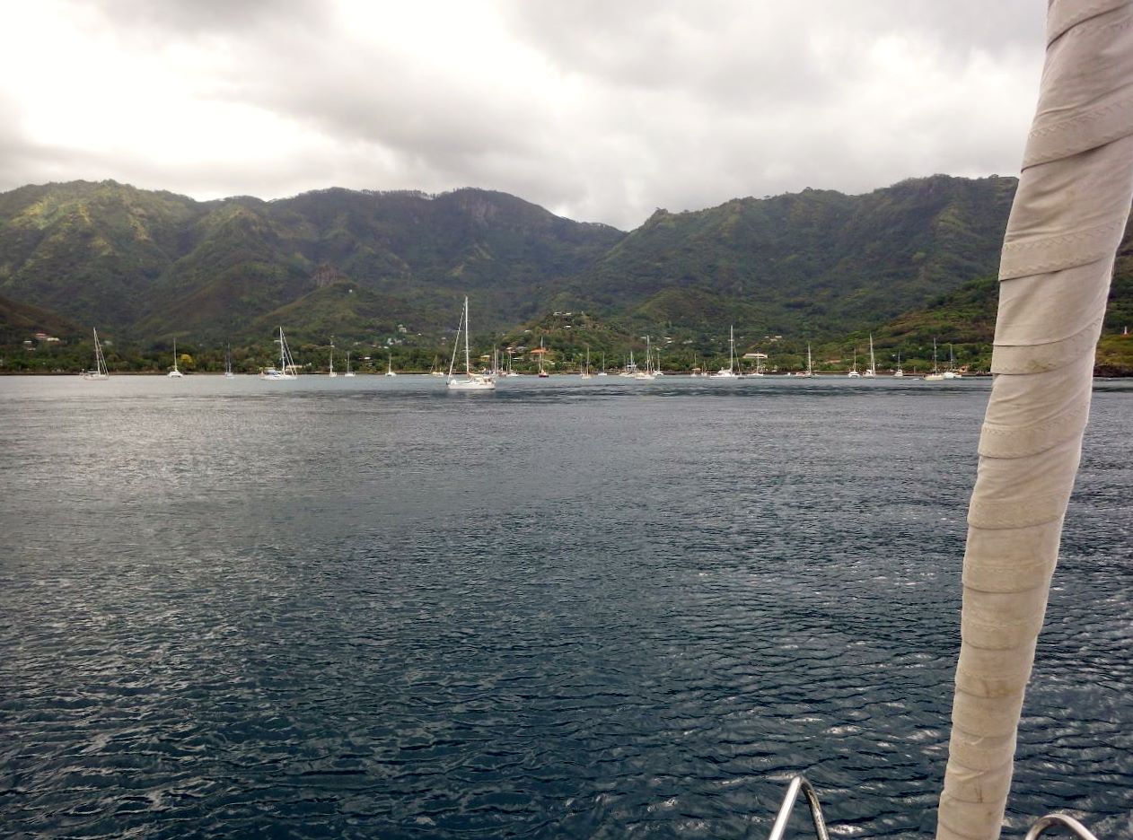 Petite navigation tranquille, de nuit, pour couvrir les 90 milles qui nous séparent d’Huku Hiva, où nous arrivons le 14 mai vers 10h, dans une baie magnifique, Taiohae, ancien cratère effondré. Une cinquantaine de voiliers sont déjà au mouillage…