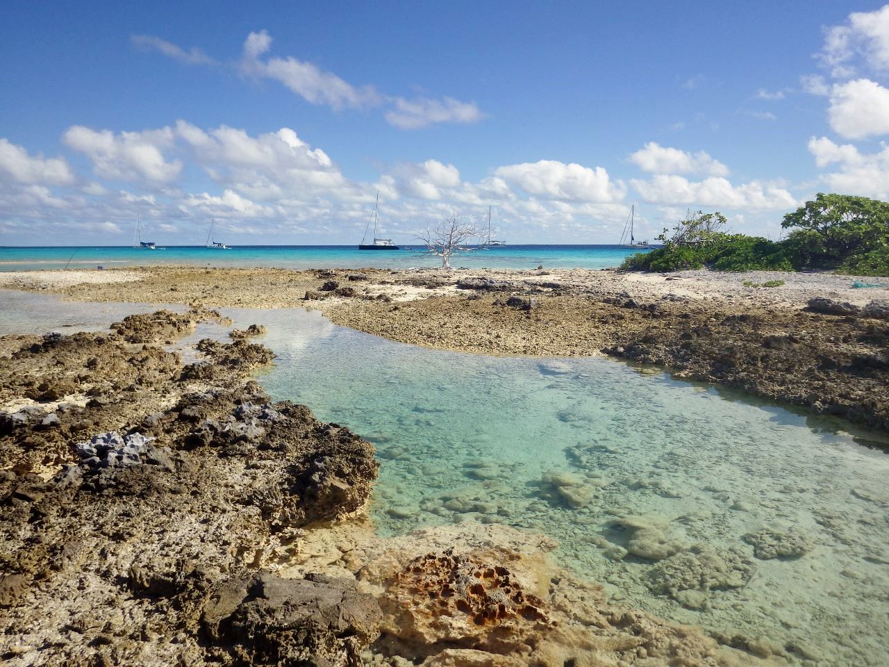 Enfin, nous revenons par le rivage bordant le lagon, vers notre mouillage. Le centre du motu est envahi de végétation et de cocotiers. L’eau est tellement limpide qu’on voit les coraux et les poissons sans masque… Même quelques pointes-noires qui sont en embuscade dans 50 cm d’eau, dans les retenues laissées par la marée basse, et qui filent quand nous traversons à pied.