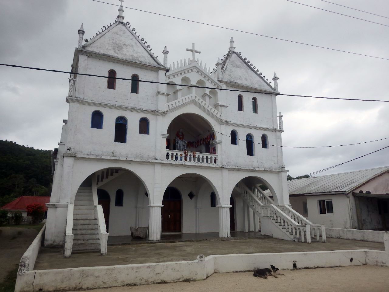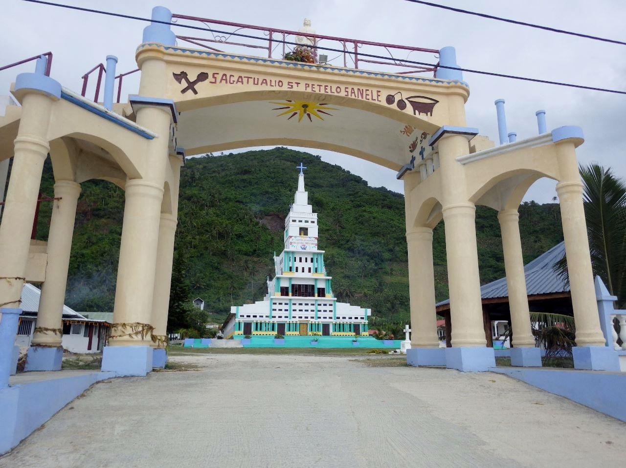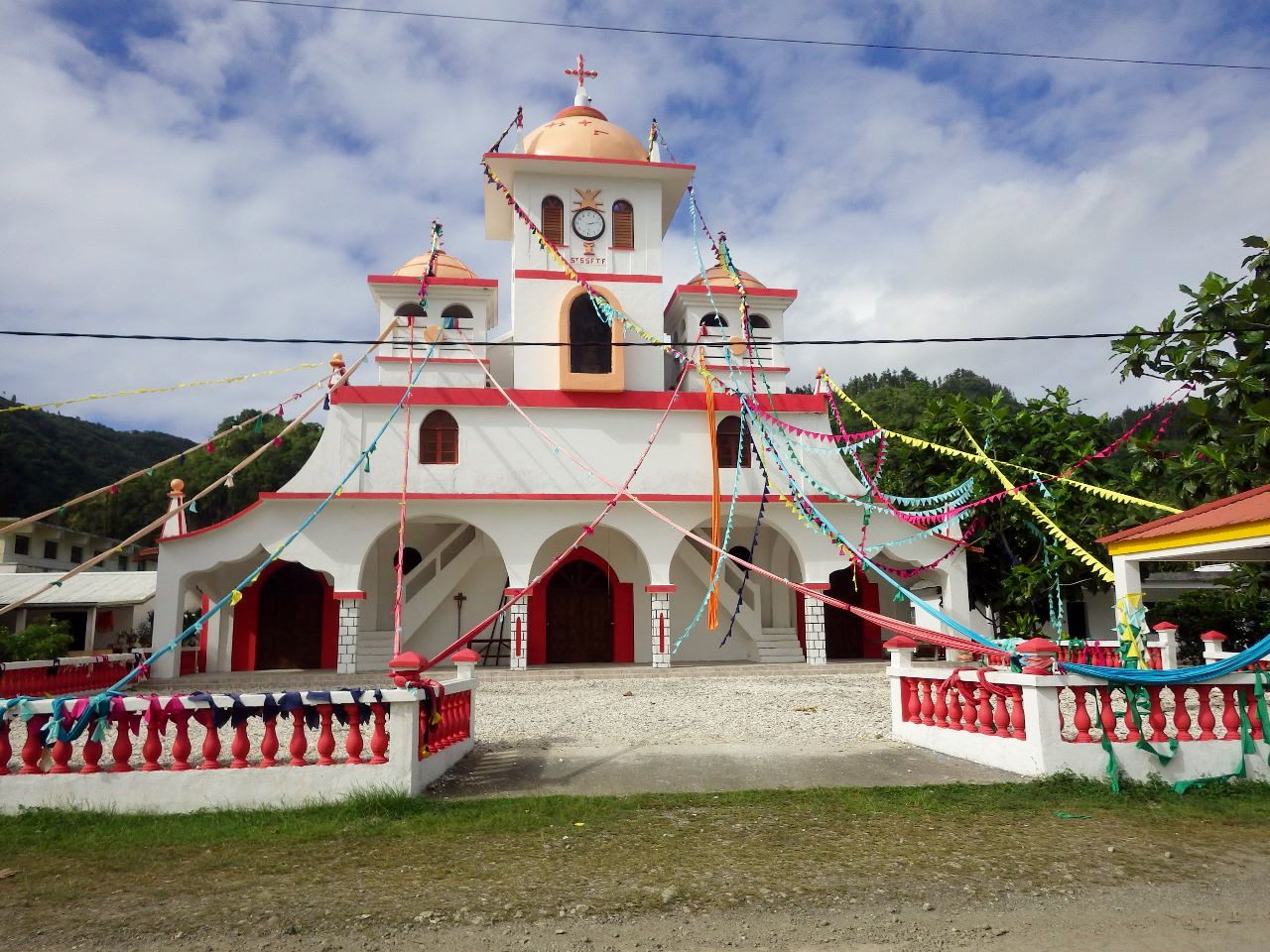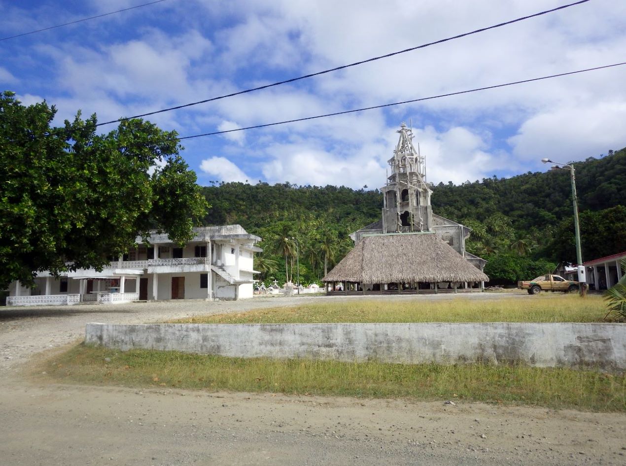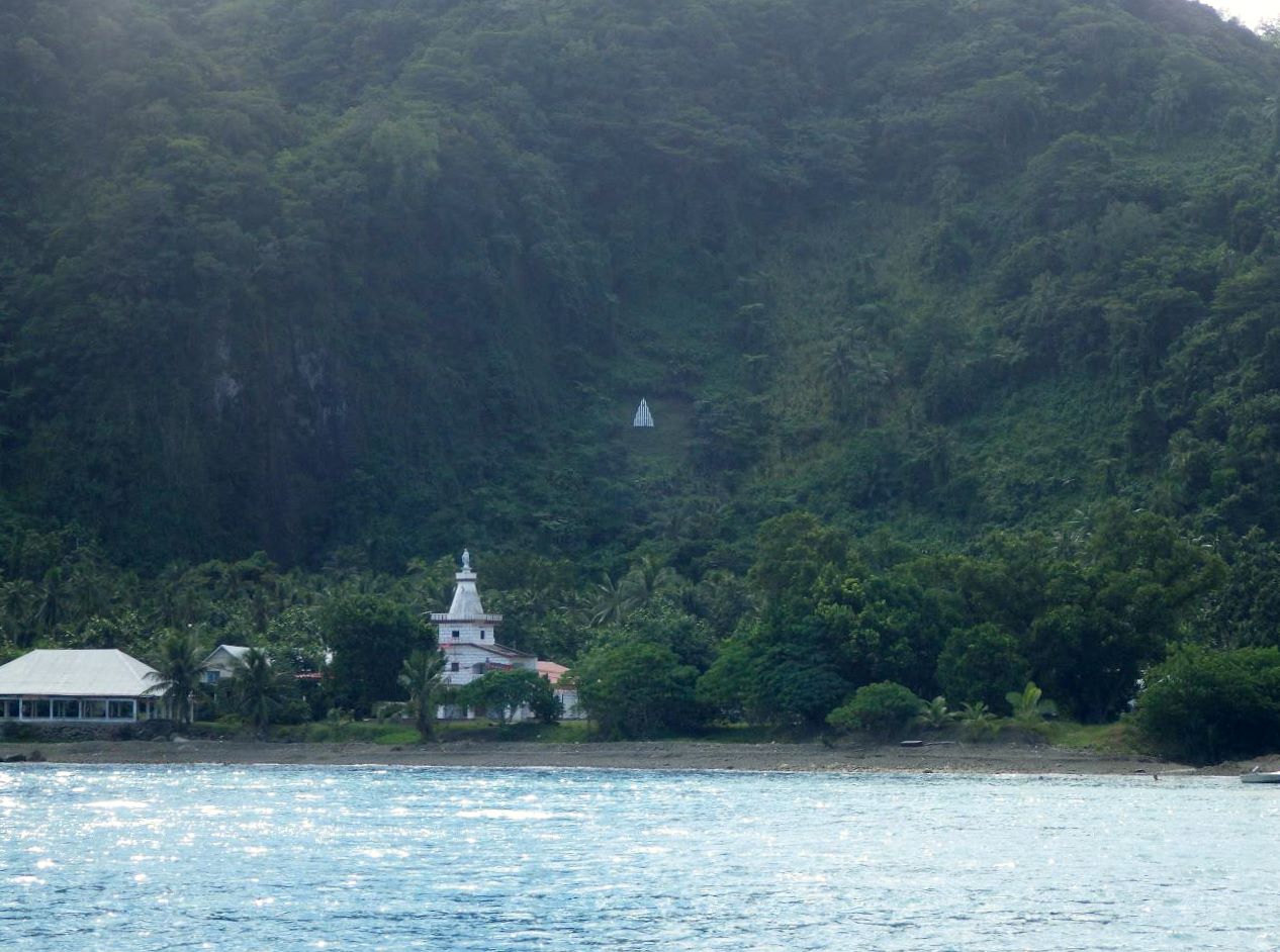L’imposante église de Leava n’a pas que pour mission de guider les âmes à la recherche d’un refuge spirituel : la statue de la Vierge au sommet de son clocher est le premier repère d’alignement pour entrer en bateau dans l’anse étroite. Le deuxième repère, gros triangle blanc, se trouve sur le flanc de la montagne.