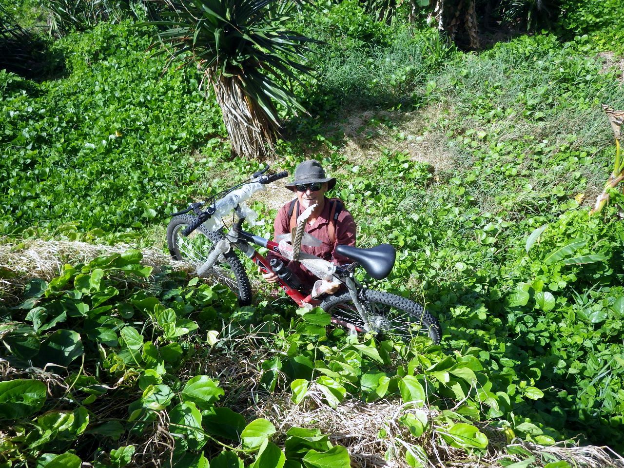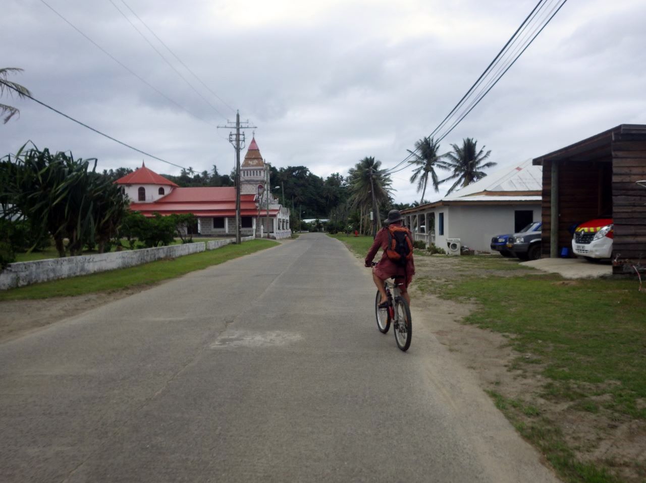 2 juin. Hélène, la douanière qui doit préparer notre autorisation de sortie (c’est son mari, Stéphane, que nous avions vu à Wallis), nous suggère d’essayer de faire le tour de l’île en vélo. Bonne idée, surtout qu’il y a une autre motivation, de taille celle-là : y en a marre de se faire ridiculiser sur la taille de nos mollets par ces gabarits hors norme de piliers de rugby. Donc on va faire ce qu’on peut pour les regonfler un peu. Et Victor se charge de nous dénicher deux bécanes. Bon d’accord, ils ont dû ressembler à des VTT un jour. Il y a même une inscription indiquant qu’ils sont équipés de Shimano : ça devait être du temps où Shimano ne faisait que des moulinets de pêche… Mais nous n’allons pas faire la fine bouche : nous avons eu nos VTT en moins d’une demi-heure, et ils roulent. Le bouche à oreille et la gentillesse des Futuniens ont suffit. Et on ne vient pas à Futuna pour essayer les derniers clous à la mode.