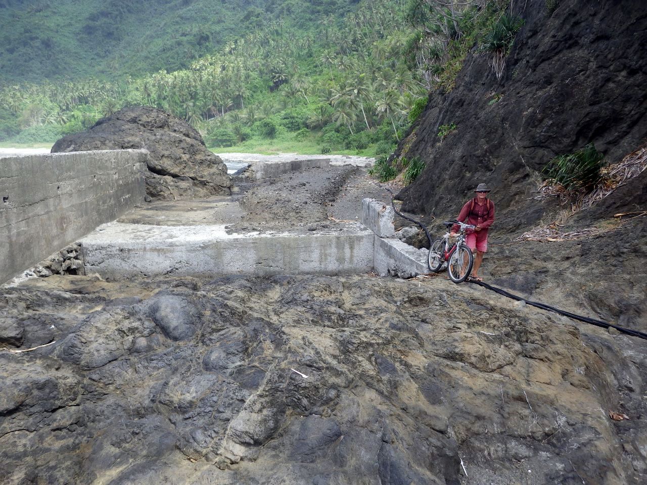 La route se change en piste, puis en rien du tout : un cyclone s’est chargé de la faire disparaître sur un bon kilomètre qui se transforme vite en parcours du combattant.