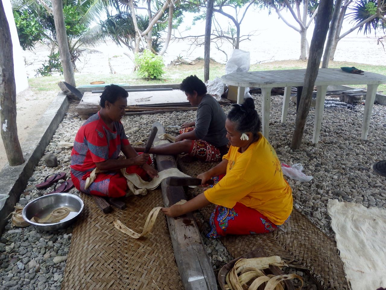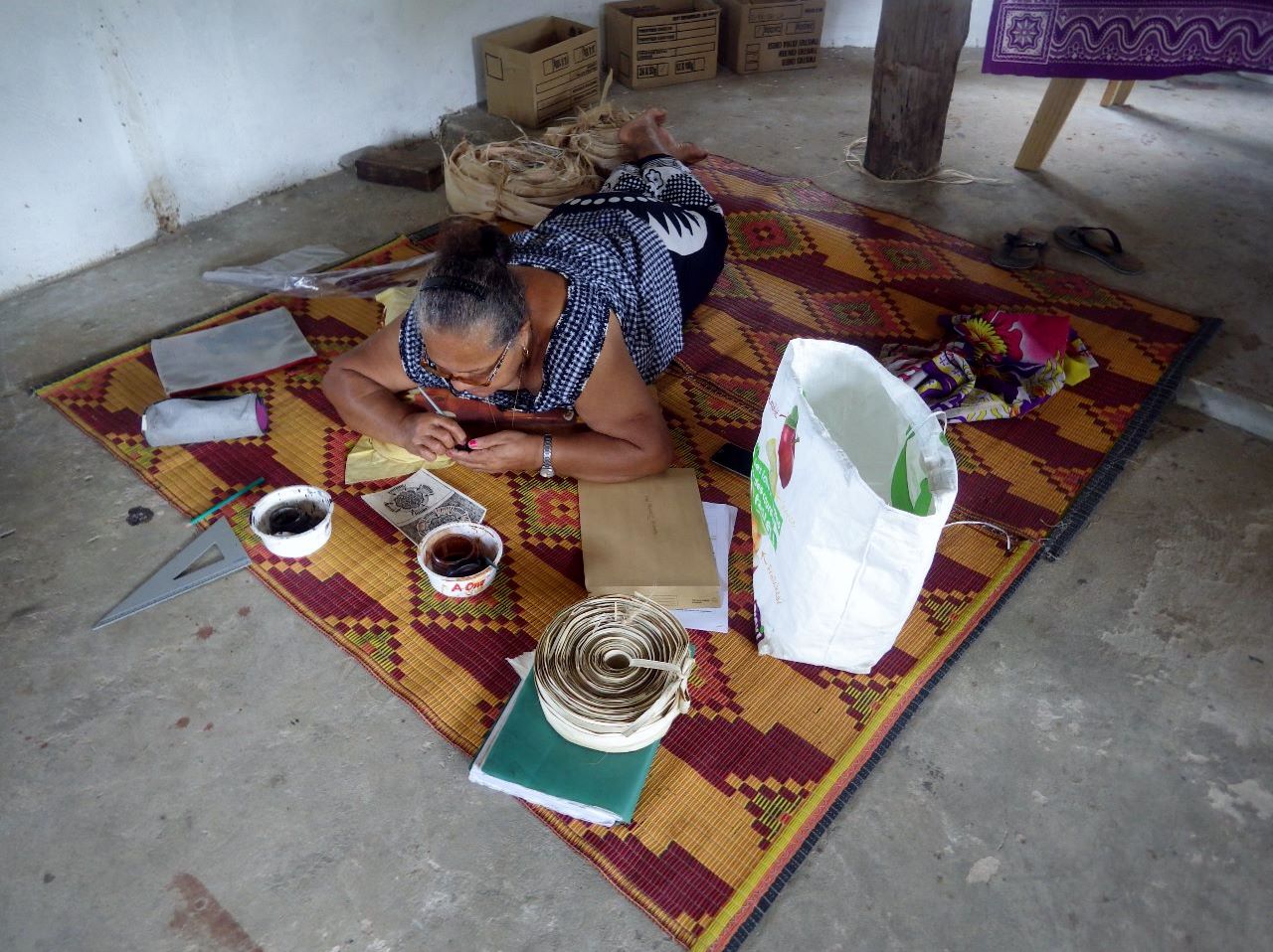 Nous entendons souvent des bruits de percussion devant beaucoup de maison : en fait, des femmes préparant le tapa, sorte de parchemin fait d’écorce de mûrier sauvage aplati avec des maillets sur un tronc en bois dur, avant d’être lavé, puis blanchi à la javel, et finalement enduit d’amidon (pour empêcher l’encre de diffuser). Un dernier séchage et les artistes reproduisent les dessins géométriques traditionnels avec une teinture naturelle proche de l’encre de Chine.