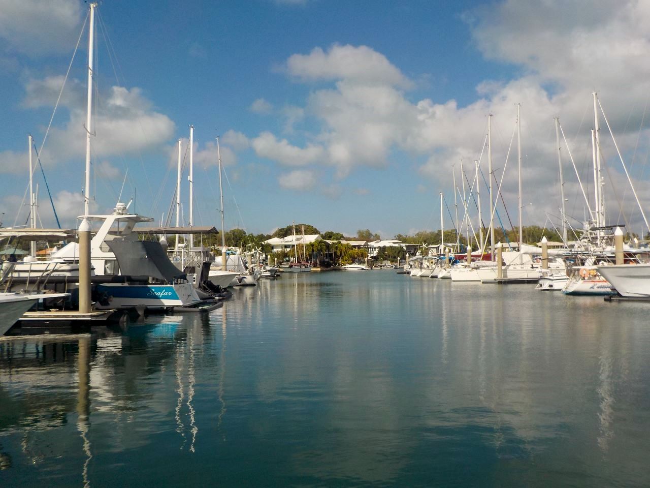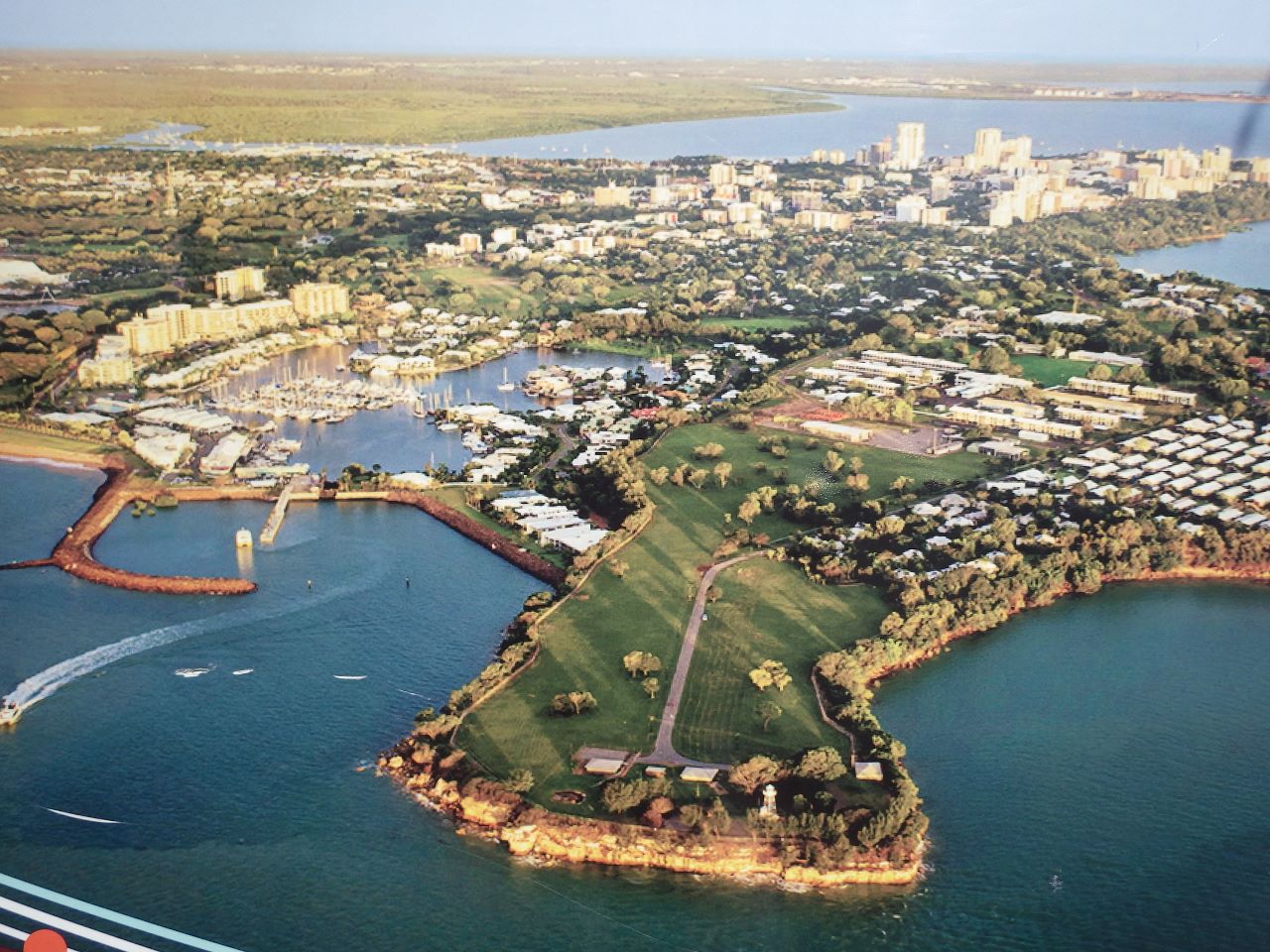 A gauche l’avant-port de la marina, avec le ponton d’accueil et l’écluse. Derrière celle-ci se trouve la marina de Cullen Bay. Et à droite dans le fond, le centre de Darwin.