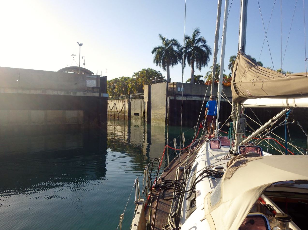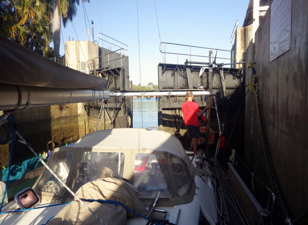 Mardi 30 août, huit heures, largement plus que les dix heures requises après l’injection du bactéricide. Les portes de l’écluse s’ouvrent : nous pouvons enfin entrer dans la marina de Cullen Bay.